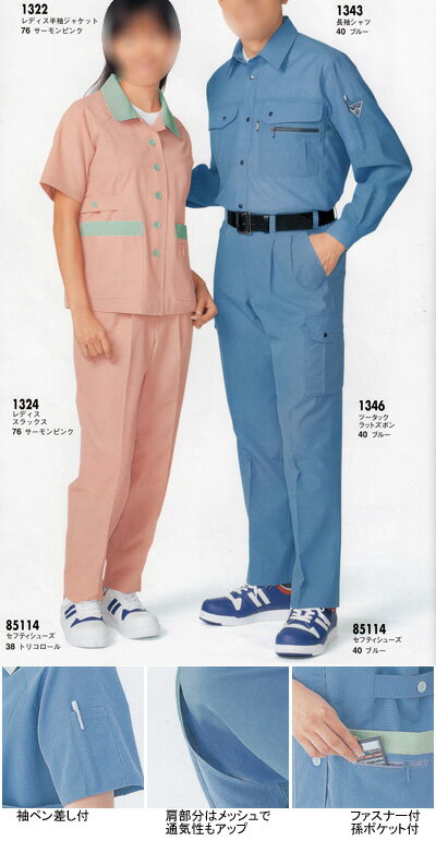 商品説明●関連商品※1341半袖ブルゾン※1344長袖ブルゾン※1342半袖シャツ※1343長袖シャツ※1340ツータックスラックス※1346ツータックラットズボン※1324レディーススラックス●春夏用●素材:ポリエステル80%・綿20%●XEカット、帯電防止素材、吸汗・速乾、清涼、ピンク系●サイズ:7号(胸囲/100、裄丈/42、着丈/61)、9号(胸囲/104、裄丈/43、着丈/64)、11号(胸囲/108、裄丈/44、着丈/67)、13号(胸囲/112、裄丈/45、着丈/68)、15号(胸囲/116、裄丈/46、着丈/68)、17号(胸囲/120、裄丈/47、着丈/68)●カラー:ブルー、グリーン、サーモンピンク●機能:ファスナー付孫ポケット付、袖ペン差し付、樹脂ファスナー、樹脂ボタン商品仕様●通気性に優れムレにくい涼感作業服。