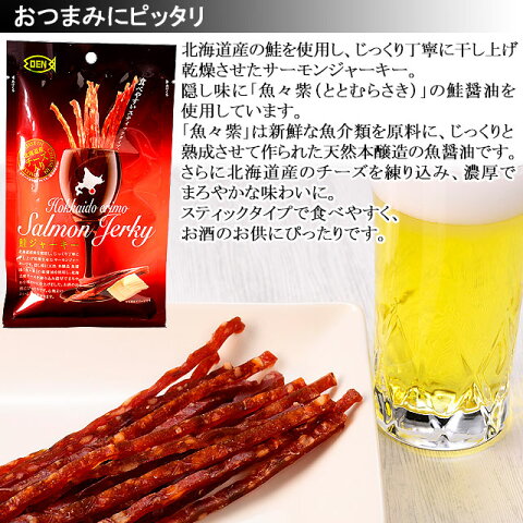 鮭ジャーキーの商品説明 名称 魚介加工品 原材料名 鮭(北海道産)、プロセスチーズ(北海道産)、米醗酵調味料、粉末水飴、食塩、こしょう、ガーリックパウダー、オニオンパウダー、魚醤、調味料(アミノ酸等)、ソルビトール、pH調整剤、くん液、着色料(紅麹色素、パプリカ色素) 内容量 35g 賞味期限 商品に記載されています。